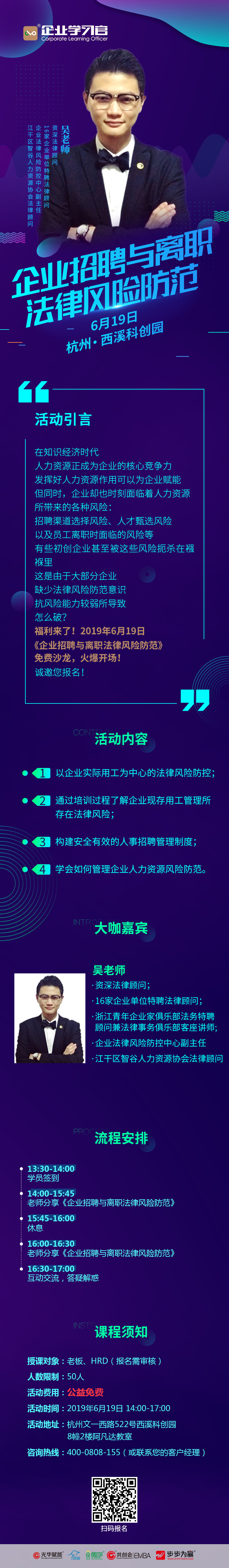 人力資源在如今這個知識經濟時代,是企業的核心競爭力所在,但同時人力資源也會給企業帶來各種不確定性的風險,如何加強風險防范?6.19《企業招聘與離職法律風險防范》為你出謀劃策!