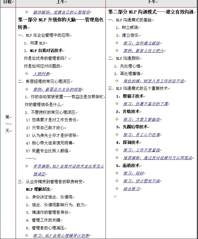 2、學(xué)習(xí)NLP溝通模式,學(xué)會(huì)樹(shù)立權(quán)威及與他人建立信任的技巧,并掌握恰當(dāng)?shù)腘LP溝通技巧,為團(tuán)隊(duì)管理打好基礎(chǔ);