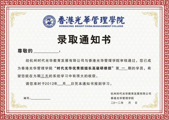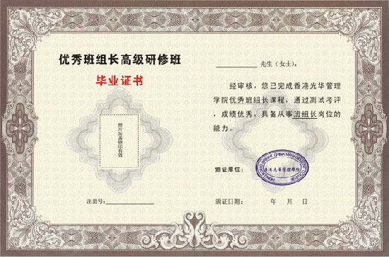 1、本培訓為非學歷項目,由中國企業聯合會、香港光華管理學院進行聯合資格認證,每位完成培訓計劃的學員將獲得以上兩者聯合頒發的“優秀班組長高級研修班” 結業證書。