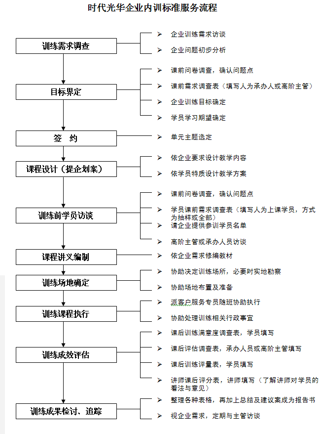 杭州時代光華作為企業的培訓顧問,為企業分析深層次培訓需求,制訂切合實際的培訓計劃,按照標準的培訓流程體系規范實施每次培訓,同時對全過程實施質量控制。我們采用專業知識與培訓對象調研結合的方式提供專業服務,并在此基礎上舉行一系列以培訓需求為導向,培訓對象抽樣參加的研討會以收集資料、切實把握培訓需求,并藉此提出杭州時代光華培訓的專業性建議。