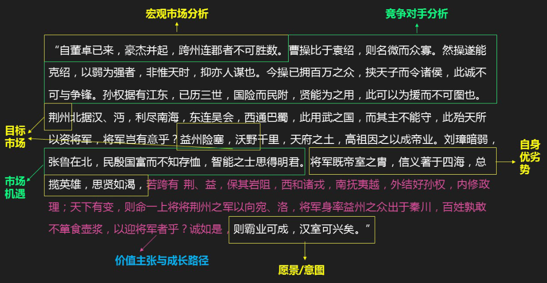 第一句在說時局,商業環境中叫做宏觀市場環境,劉備面臨的宏觀市場環境中有一個非常大的機會,叫做爭霸天下。