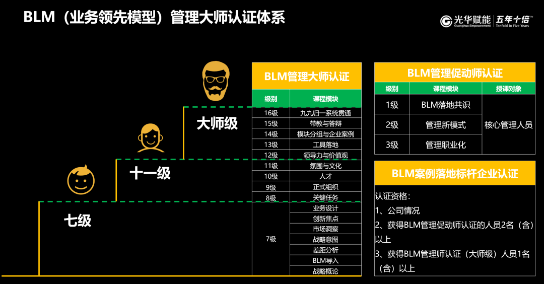 BLM 管理師認證分為三期,分別是 L1-L7 級、L8-L11 級、L12-L16 級。每個 Level 都布置了相應的作業,通過嚴格的考試測驗后,才能進階通關。