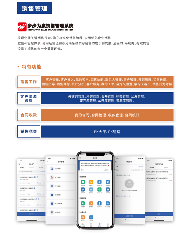 步步為贏銷售管理系統梳理企業關鍵銷售行為、確立標準化銷售流程、全面優化企業銷售激勵和管控體系,利用經驗值和積分兩條線貫穿銷售的成長和發展,全面的、系統的、有效的管控員工銷售的每一個環節。