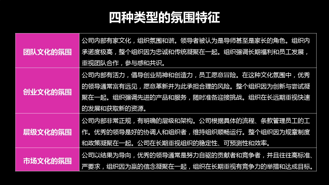 每個企業的文化都有一定的傾向性,有的公司的文化可能更傾向于團隊文化的氛圍,有的公司可能更注重市場文化的氛圍。