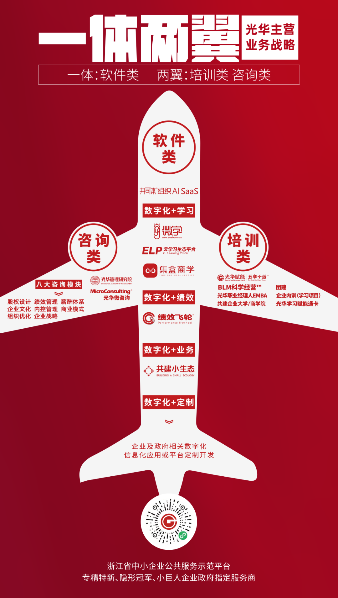 方永飛認為光華賦能的業務模式是“一體兩翼”,一體就是軟件,兩翼是培訓和咨詢。過往一直是培訓和咨詢為主,他一直希望光華實現數字化業務和組織變革,這是光華的“第二次創業”。