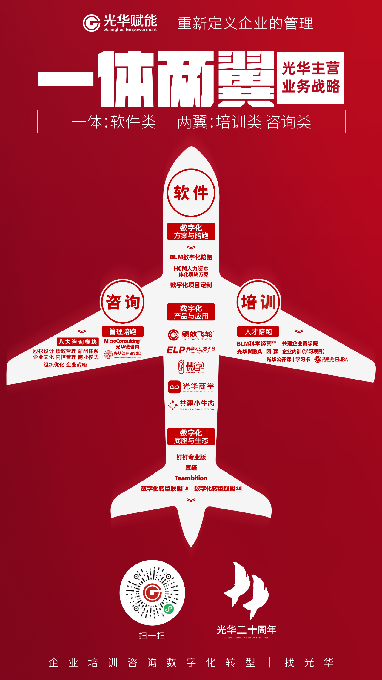 光華的戰略是一體兩翼:以軟件為主體、培訓和咨詢為兩翼,培訓、咨詢、軟件遵循的都是同樣的底層邏輯框架:BLM科學經營。