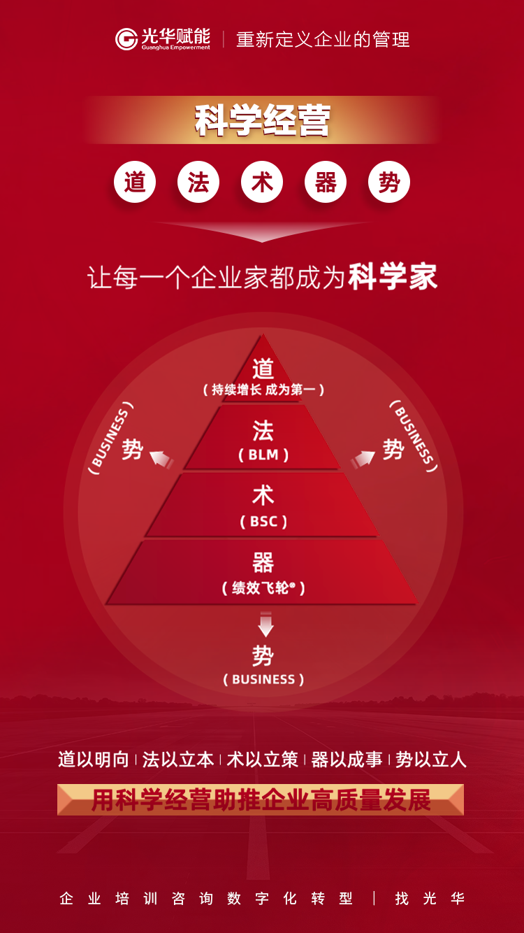 光華的使命是“用科學經營助推企業高質量發展”,愿景是“服務1萬家企業績效飛輪應用;幫助1萬家企業BLM科學經營系統落地;到2035年,賦能陪跑企業合計GDP超一萬億規模。”;價值觀是“始終堅持以客戶為中心、守正創新、團結高效”。光華落地使命和愿景踐行的方法論:“道(持續增長、做到第一)、法(BLM)、術(BSC)、器(績效飛輪)、勢(業務視角)”。