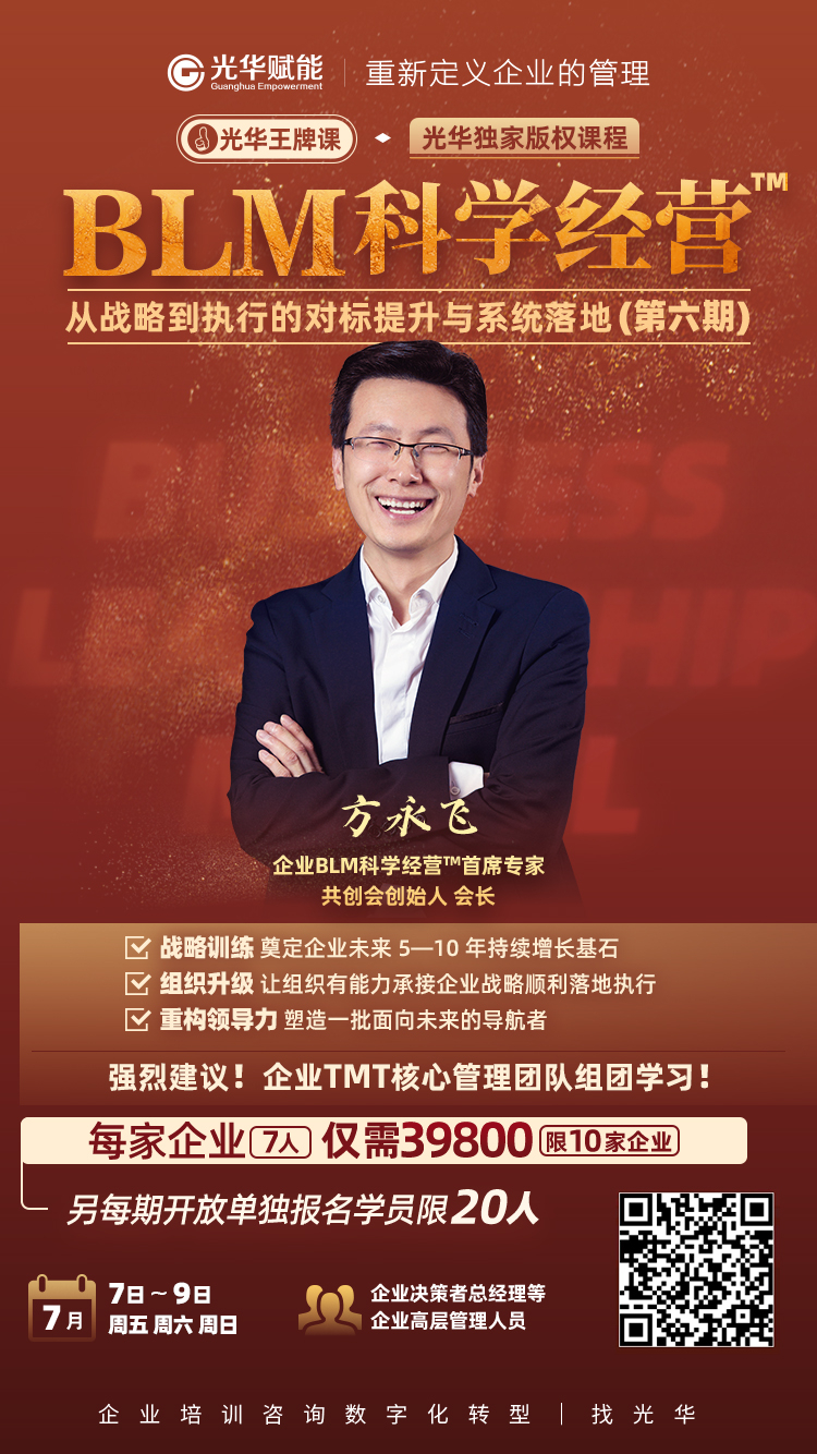 方永飛老師3天2夜的BLM科學經營班已經開過5期,廣受學員好評:從戰略到執行的一致性,避免結構性內耗;同頻共識、力出一孔,一體化落地;對標提升,有章可循,少走彎路等,特別歡迎各位老板帶領TMT團隊(核心經營班子和高管團隊)集體學習,松松土、對對焦。