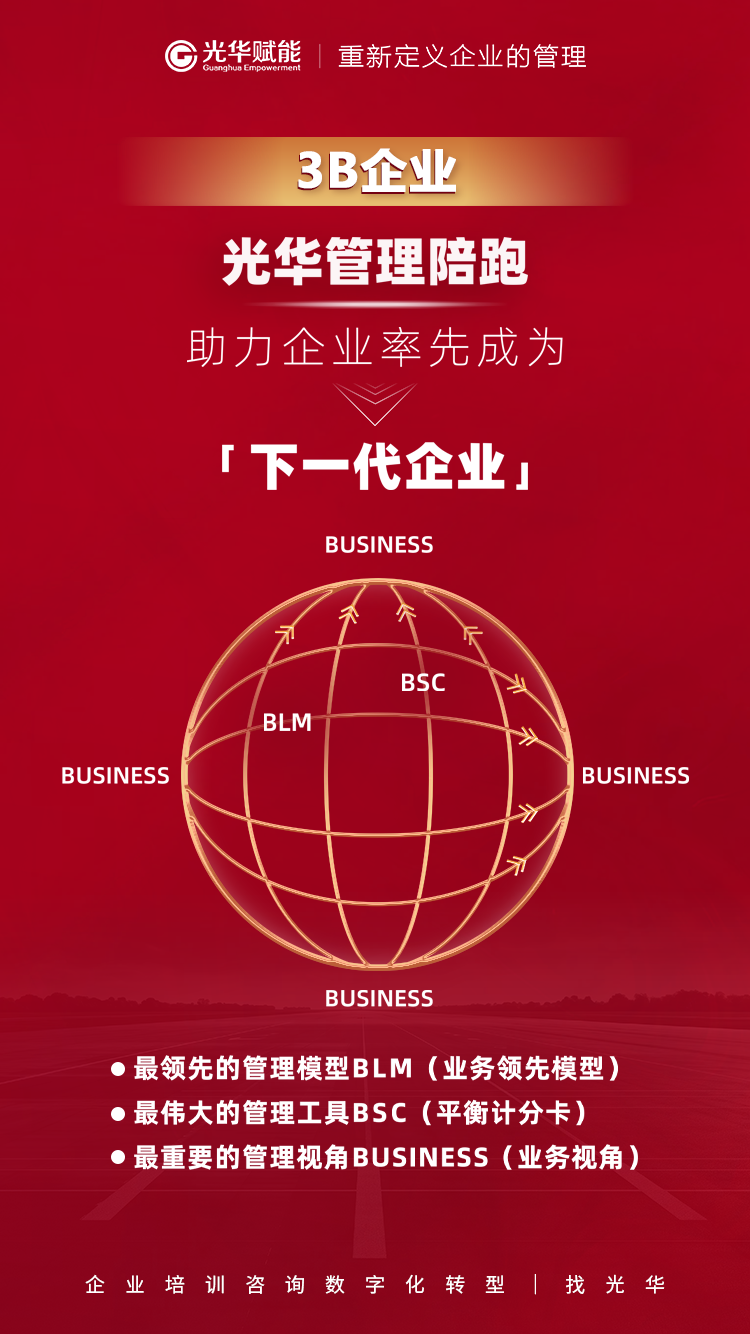 光華總結和沉淀了優秀企業的3B理論:最偉大的管理模型BLM、最偉大的管理工具BSC、最重要的管理視角Business。光華認為的業務視角:始終堅持以客戶為中心;持續增長;堅持系統性思維和全局觀;提升經營性財務。