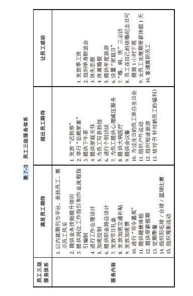 搭建海底撈用戶三級服務體系的具體動作列成表格,企業和中層在搭建員工三級 服務體系時仍然可以沿用這一方法。表 7-3 即是常用的一些做法(表中有些做法是中層職權范圍之外的,中層需要根據自己的職權范圍和主管部門的實際情況有選擇地實施)。