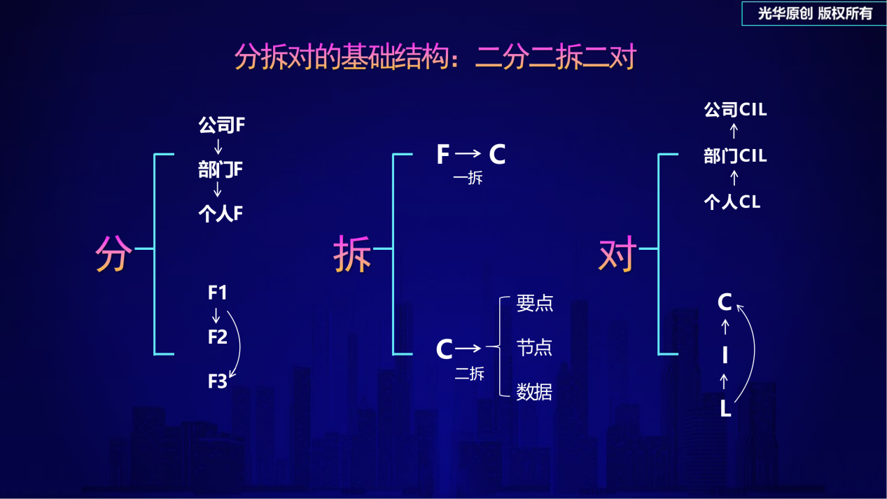 分拆對是“分解目標、拆解動作、對齊能力”的簡稱,本質是一種企業戰略解碼與執行落地方法,既是BSC(平衡計分卡)落地實踐的重要方法,也是科學經營™系統理論的重要組成部分。