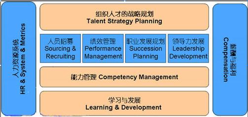 美國培訓調查機構Bersin&Associates于2007年5月發布了一份《高效人才管理架構報告》(High Impact Talent Management Framework)。闡述了人力資源管理未來發展的方向,我們可以看到學習與發展在企業組織人才的戰略規劃中的基礎作用。企業通過以能力管理為核心的學習系統運轉,實現從人才招募、績效管理、職業發展、領導力提升等一系列的組織人才發展戰略。(圖一)